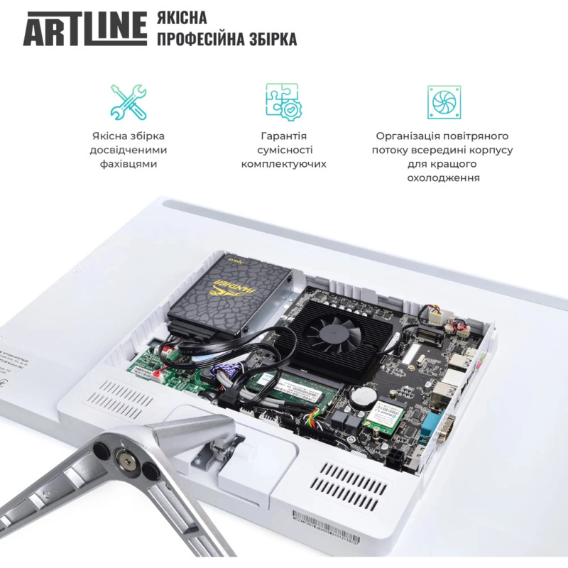 Моноблок ARTLINE Business M61v31 - стильне рішення для дому та роботи. Виробник ARTLINE забезпечує надійність із гарантією 38 місяців. Білий корпус Artline Home AiO X5 23.8" привертає увагу. Моноблок оснащений Intel Processor N95 3.4GHz, 4 ядра, з охолодженням BOX. Підтримується 16GB DDR4-3200 SODIMM оперативної пам'яті та 240GB M.2 SSD Entry Level накопичувачем. Для якісного відображення - 23.8" екран Full HD 1920x1080 з IPS матрицею. Web Camera 1.3Mp та інтегрована Intel HD відеокарта забезпечують комфортні відеоконференції. Стереодинаміки та 48W блок живлення забезпечують відмінне аудіо. Підключення через Wi-Fi 802.11ac MiniPCI-E. Операційна система не входить до комплекту.