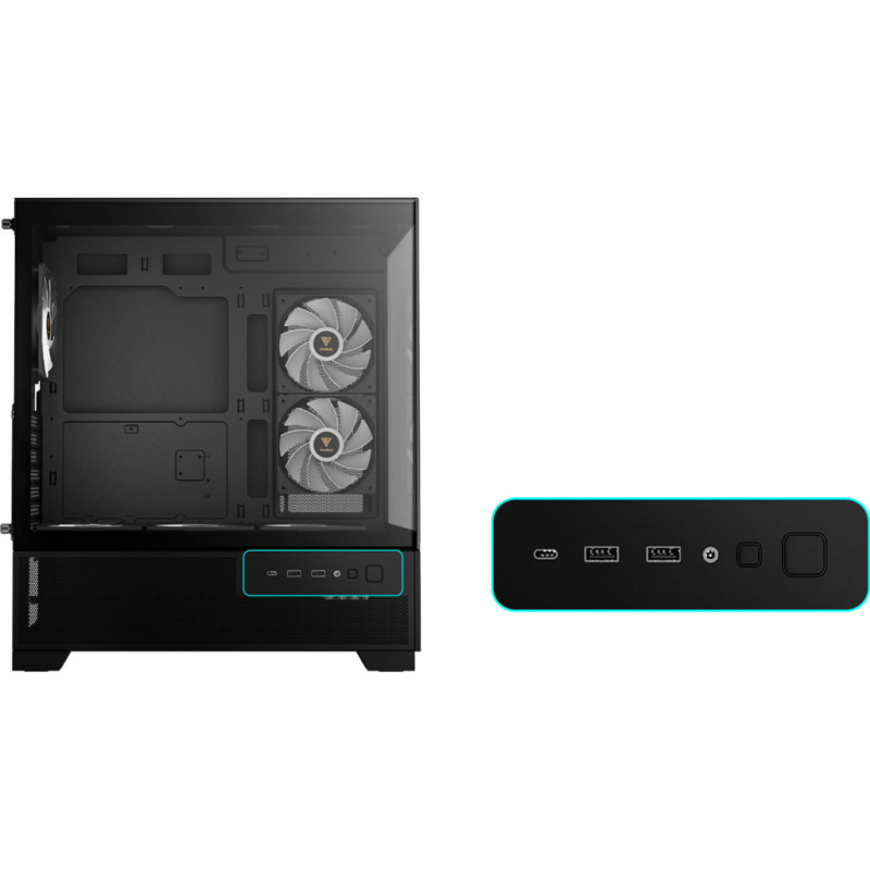 AURA GC12 ARGB — це доступний корпус mid-tower з панорамним дизайном. Він має безшовні передні та бічні панелі із загартованого скла для безперешкодного огляду, шість попередньо встановлених вентиляторів ARGB, що забезпечують яскраве освітлення та ефективний повітряний потік, просторі внутрішні компоненти та сучасну естетику, що демонструє вашу збірку.