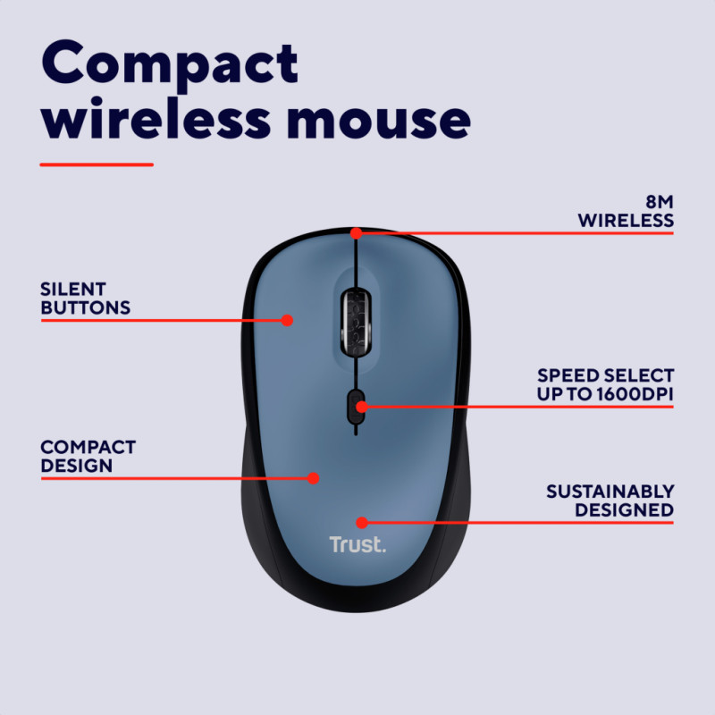 TRUST Yvi+ Silent Mouse — компактна бездротова миша з безшумними кнопками; виготовлена з 82% перероблених матеріалів.